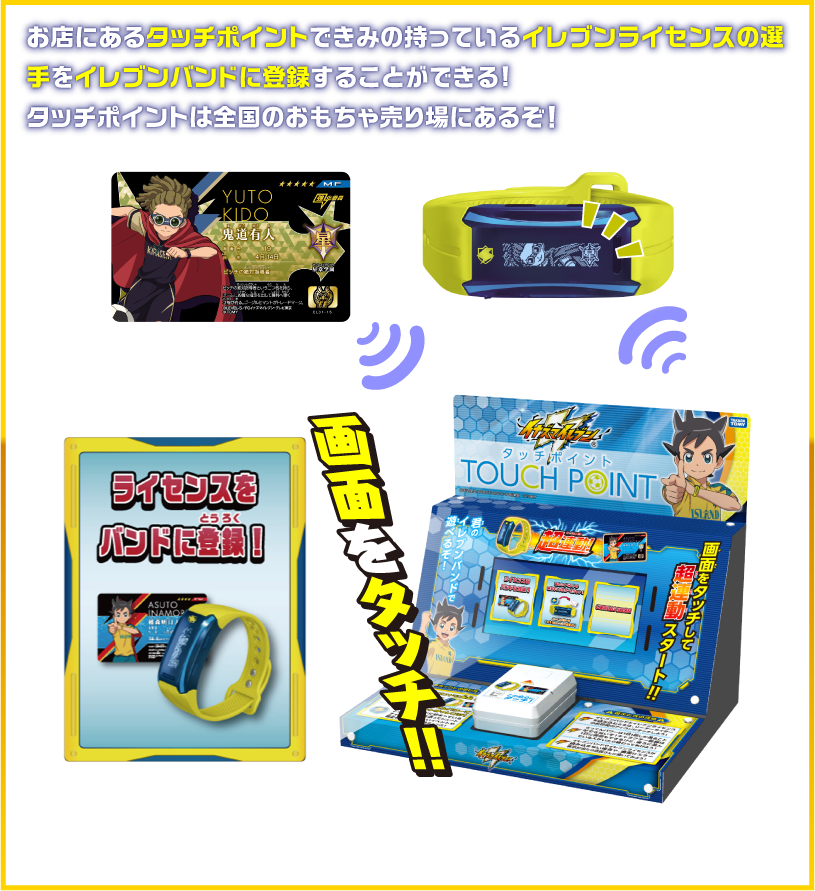 - La communication entre le bracelet et les cartes Eleven License ne pourra se faire que par l’intermédiaire du jeu vidéo, ou d’une borne Touch Point (voir plus bas). Les cartes Eleven License débloquent le personnage associé dans le bracelet en tant que compagnon.