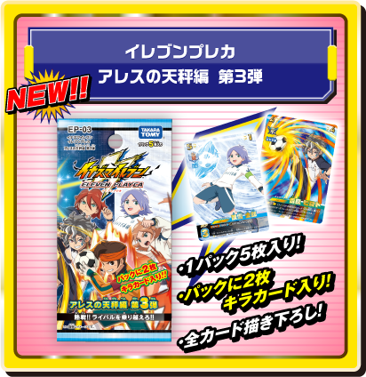 Les premières images montrent que le focus sera sur les équipes de Hakuren (Shirou et Atsuya), Eisei (Tatsuya et Hiroto), et potentiellement Tonegawa Tousen, avec la présence d’Endou sur la boîte. À noter qu’il s’agit de la première fois que nous voyons le visage d’Endou dans Ares. On suppose qu’il y aura également quelques cartes de personnages de Zeus, étant la seule équipe du Football Frontier à ne pas être apparue jusque là.