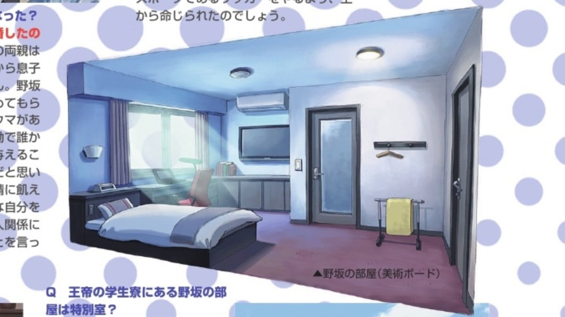 R : Il n’y a pas de différence particulière entre sa chambre et les autres, mais je pense que comme Nosaka fait partie du top d’Ares, il est plutôt bien traité. Il y a une baignoire, on dirait une chambre d’hôtel — mais quand on voit Nishikage y entrer comme dans un moulin, on dirait que la porte ne peut pas être fermée à clé. Peut-être est-ce pour empêcher les élèves de s’enfermer dans leur chambre à double tour ?
