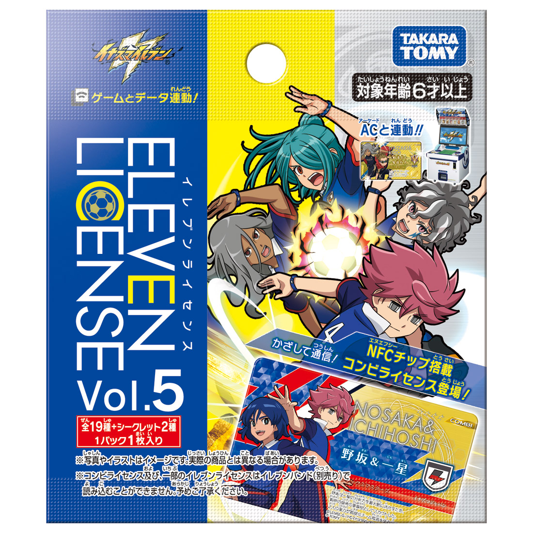 Logiquement intitulée Eleven License Vol.5, cette 5ème série de cartes NFC à collectionner laisse une nouvelle fois la part belle à Inazuma Japan, en incluant notamment les cartes des joueurs absents de la série précédente, tels que Fubuki et Fudou visibles sur le côté de la boîte. Il est également possible que, comme dans la série Vol.4, des joueurs d’autres équipes rivales tels qu’Andreas Bebo de l’Arabie Saoudite figurent dans la liste.