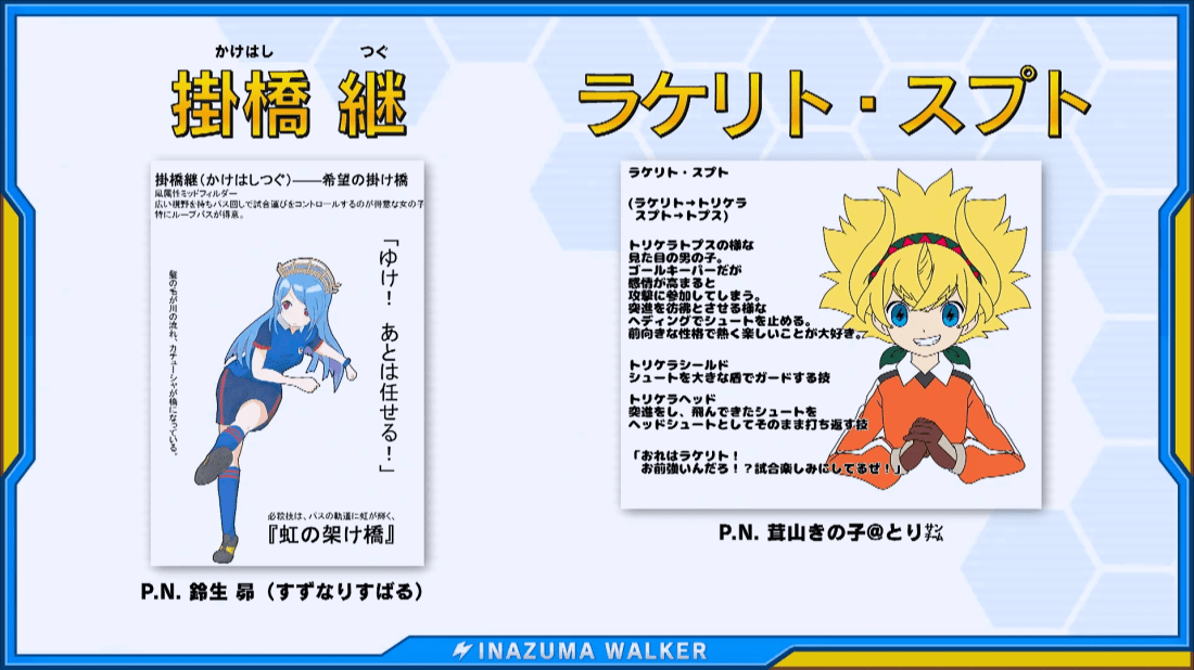 Kakehashi et Rakerito apparaîtront tous les deux dans Inazuma Eleven Orion, mais on ignore encore dans quel contexte. À titre de comparaison, Ponko Tanukigahara et Jou Muhyou, les deux vainqueurs du concours précédent, étaient apparus dans Inazuma Eleven Ares en tant que membres de l’équipe du collège Tonegawa Tousen ; il n’est donc pas impossible que ces deux joueurs fassent partie d’une des équipes du FFI.