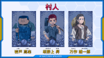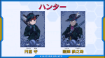 Hino et Mo-chan sont d’abord revenus sur les illustrations visibles dans le générique de fin de l’anime. Ces cartes sont inspirées de la variante japonaise du jeu du loup-garou (jinrou game), et chaque membre d’Inazuma Japan dispose d’un rôle issu de ce jeu. Voici la liste des cartes :