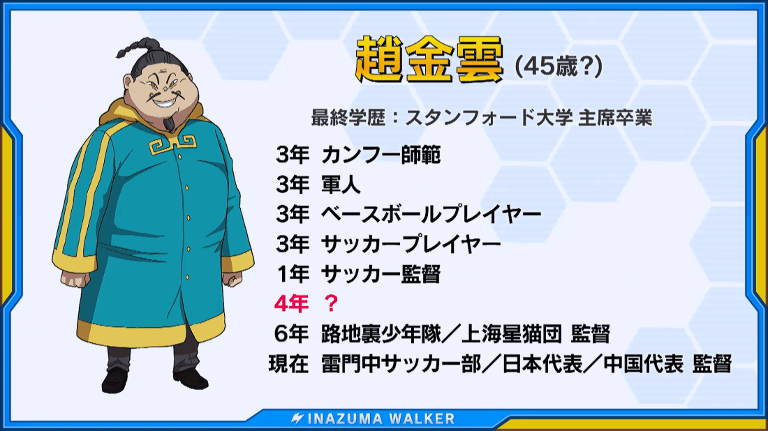 Il y a donc encore un trou de 4 ans dans le passé de Kin’un Chou. Qu’a-t-il bien pu faire durant ces 4 ans ? Dans l’épisode 3 d’Inazuma Eleven Orion, une conversation téléphonique avec le président Girikanan de la Fondation Orion laissait entendre qu’ils se connaissaient, le coach du Japon aurait-il fait partie de la Fondation durant ces 4 années ? Cela a-t-il un lien avec son exclusion de l’association de football ?