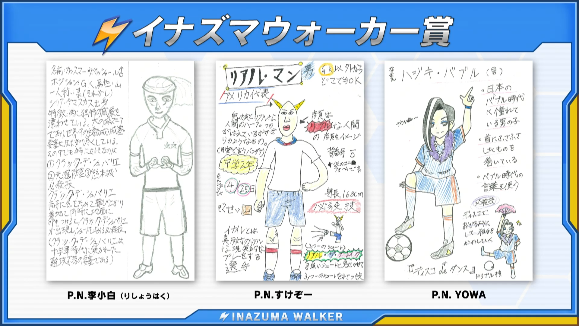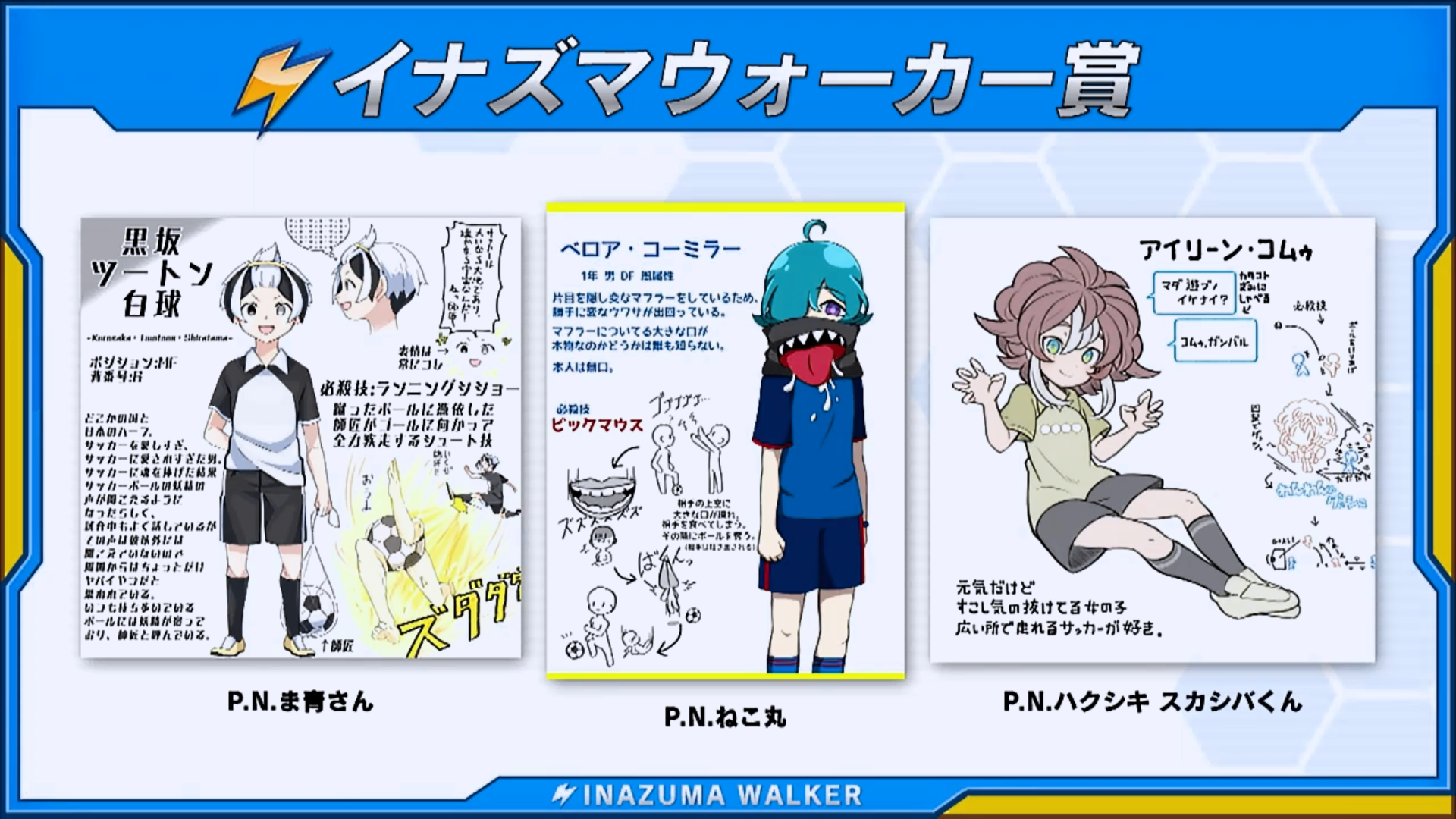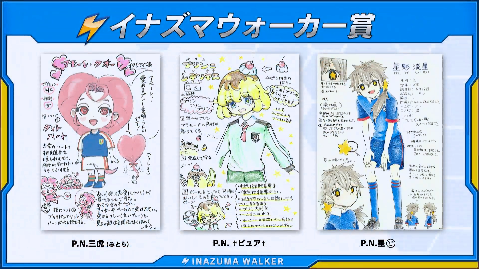 Le premier segment de l’émission était consacré au concours de création de personnage, lancé il y a quelques mois. Comme lors du premier concours organisé pour Inazuma Eleven Ares, les fans étaient invités à dessiner un personnage de leur invention, avec à la clé une apparition dans la série. Le concours a visiblement été un grand succès car plus de 1200 participations ont été reçues.