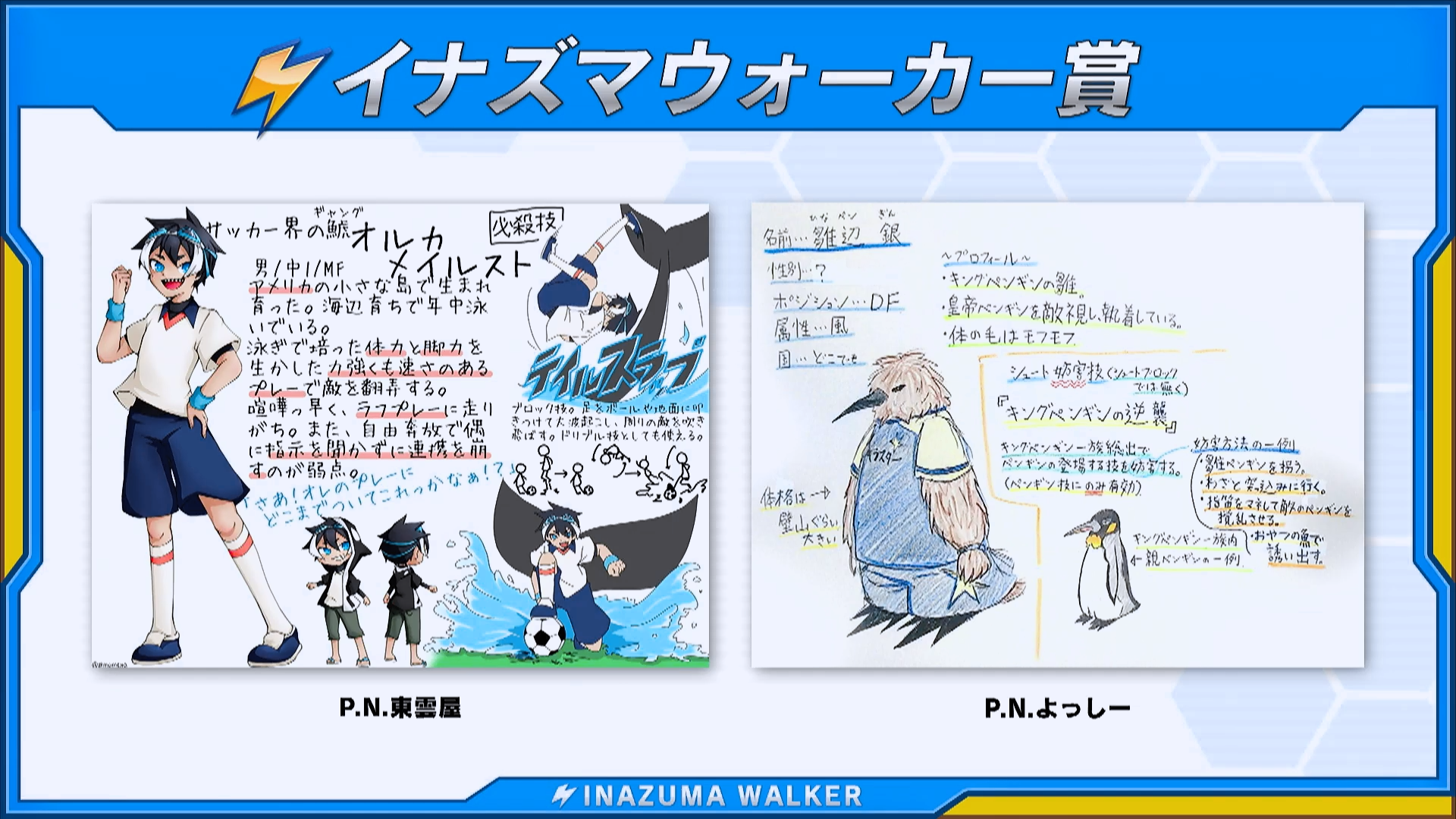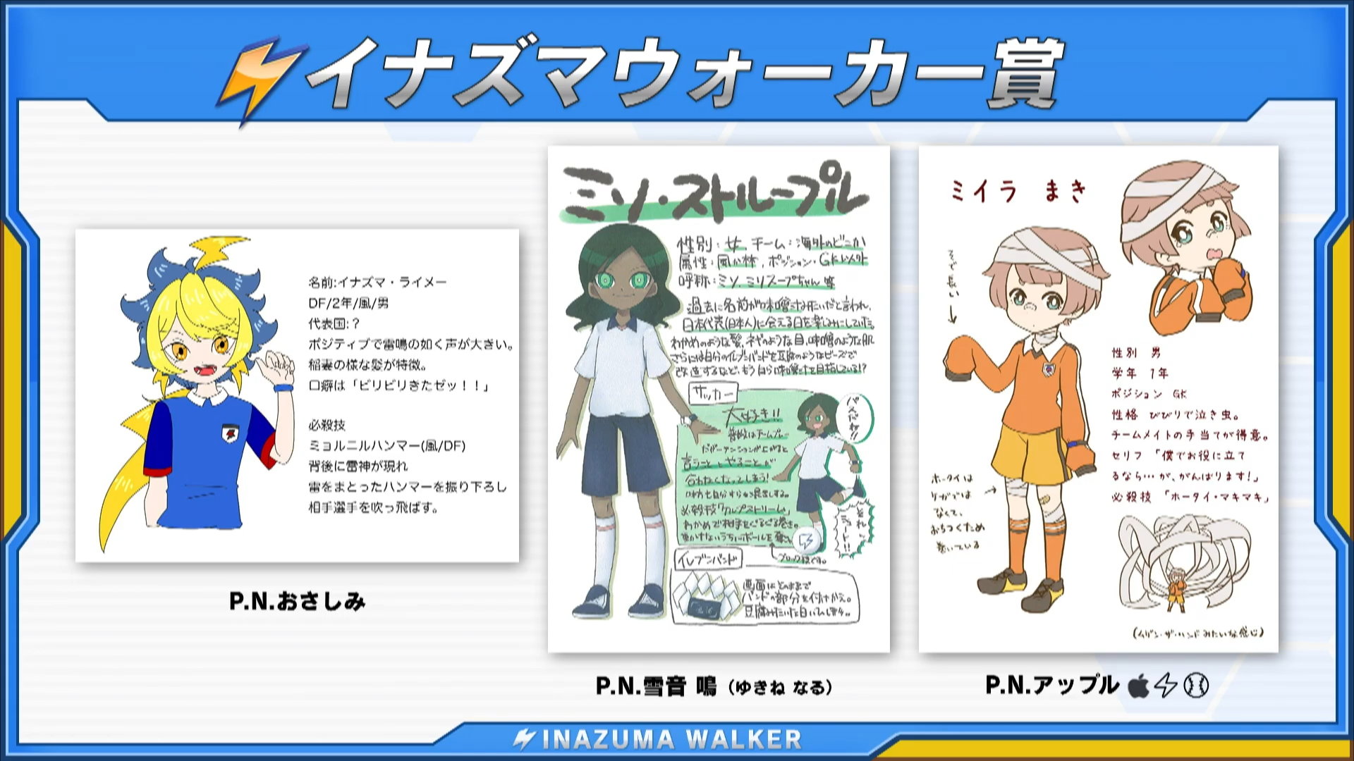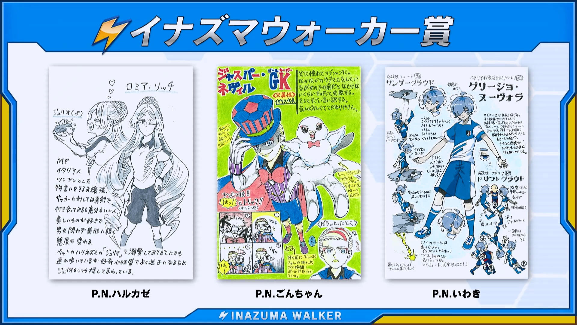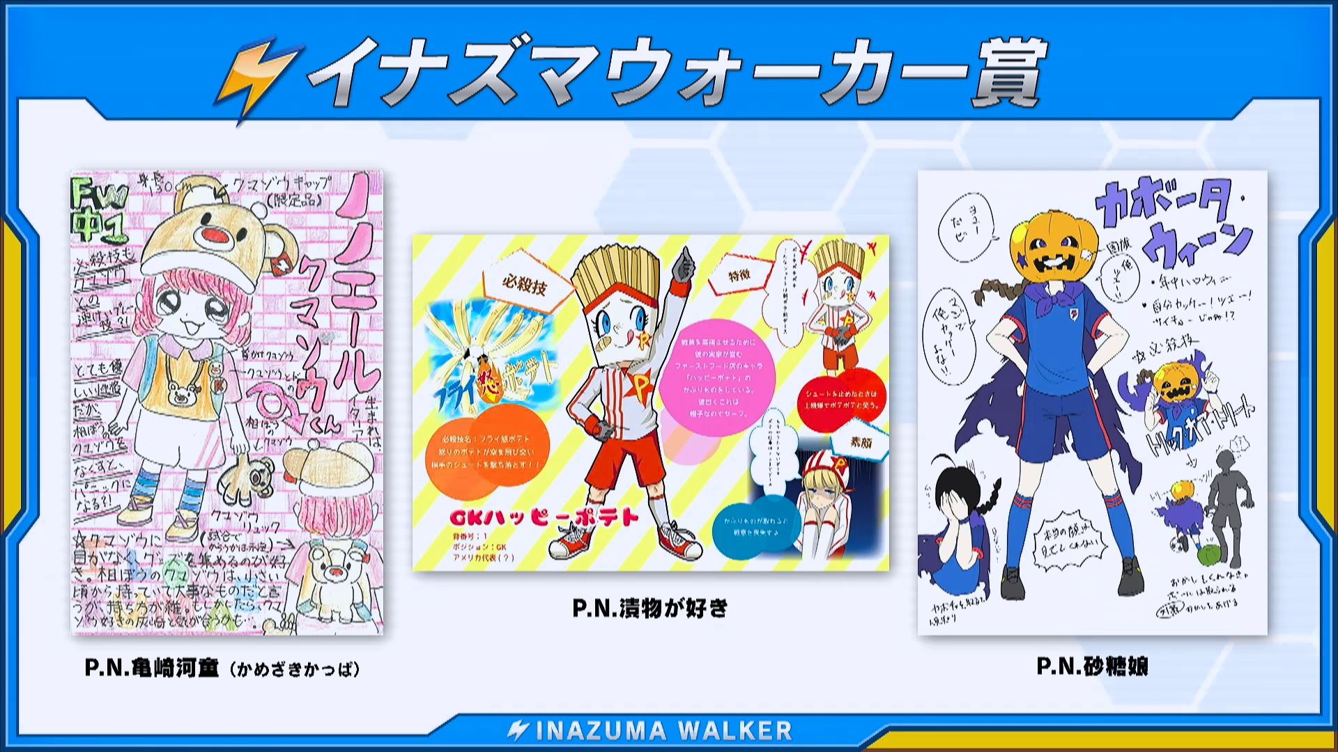 Le premier segment de l’émission était consacré au concours de création de personnage, lancé il y a quelques mois. Comme lors du premier concours organisé pour Inazuma Eleven Ares, les fans étaient invités à dessiner un personnage de leur invention, avec à la clé une apparition dans la série. Le concours a visiblement été un grand succès car plus de 1200 participations ont été reçues.