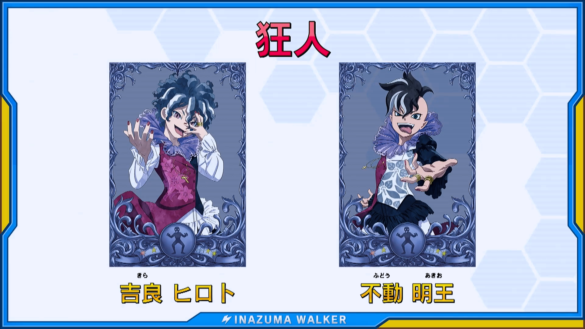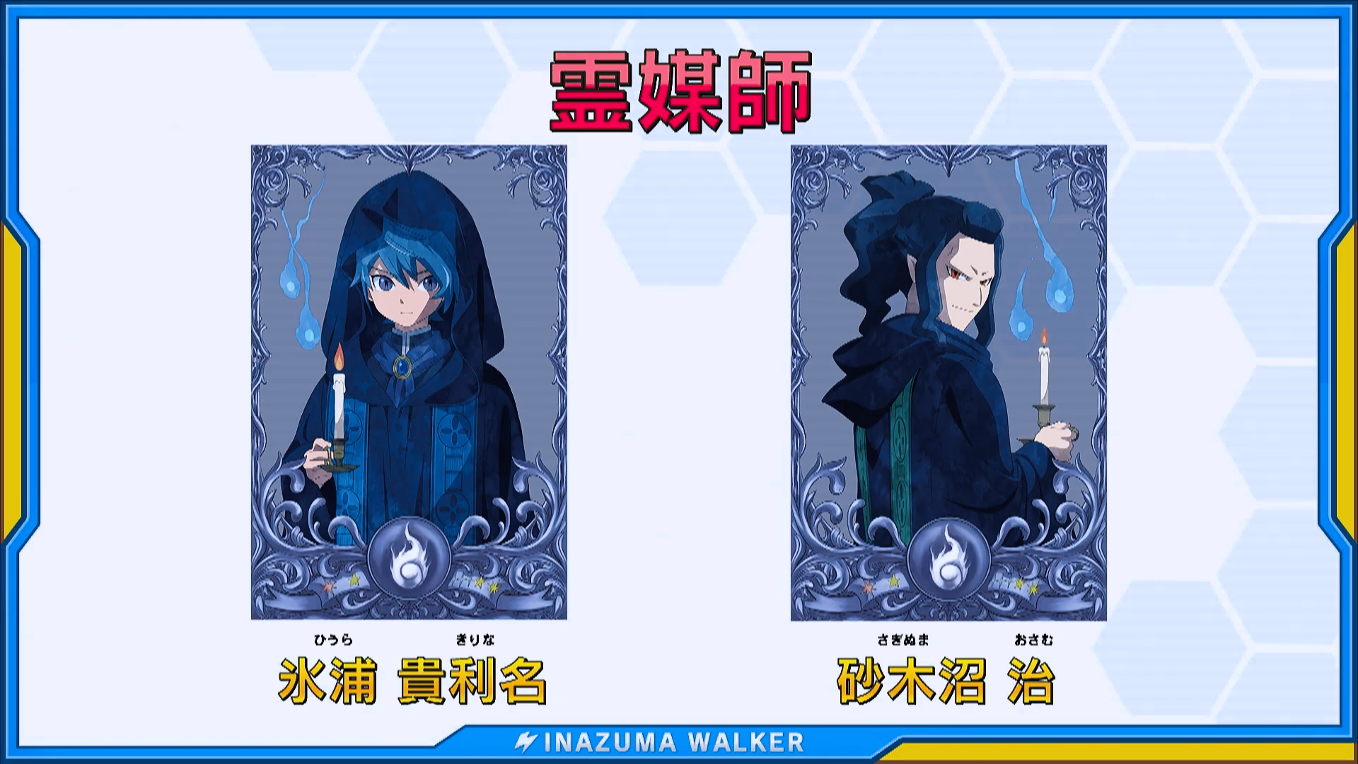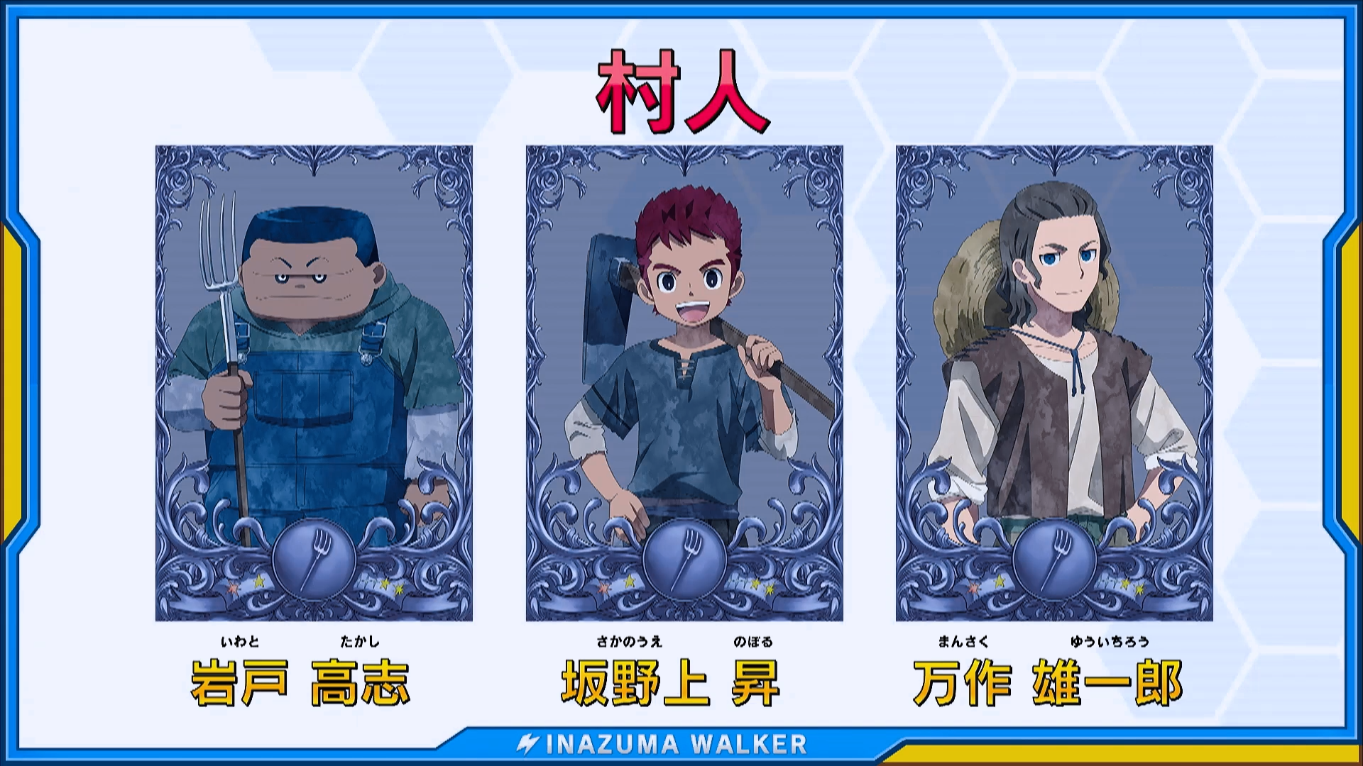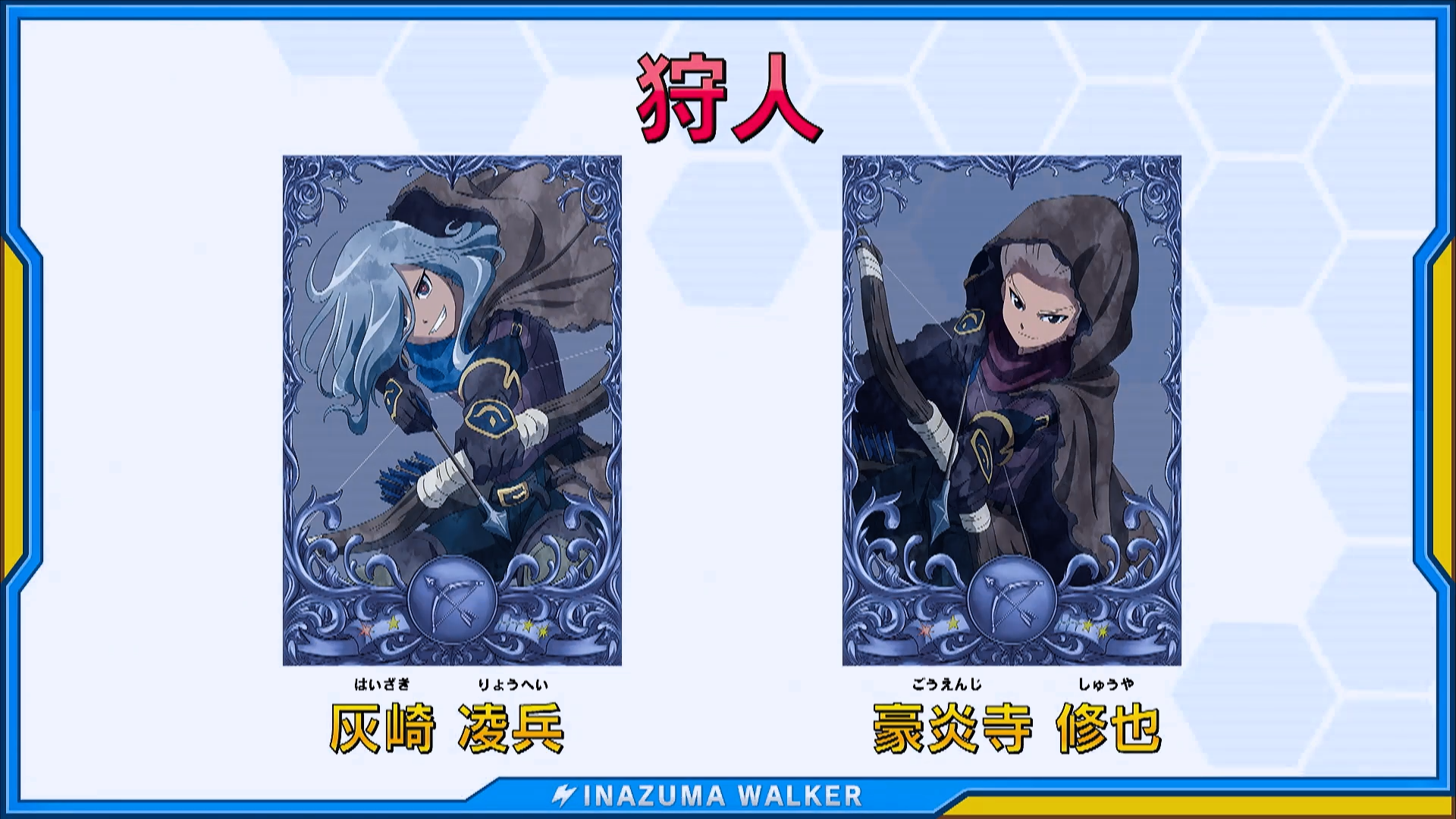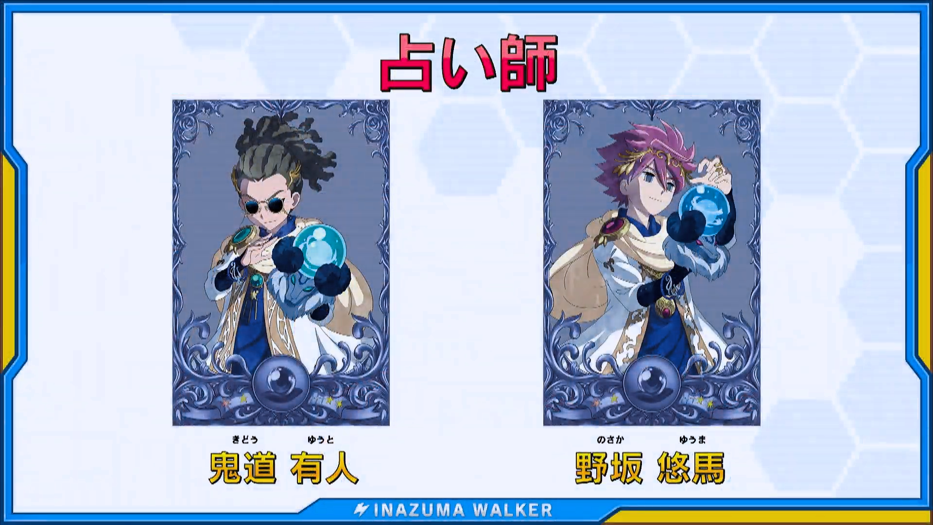 Hino et Mo-chan sont d’abord revenus sur les illustrations visibles dans le générique de fin de l’anime. Ces cartes sont inspirées de la variante japonaise du jeu du loup-garou (jinrou game), et chaque membre d’Inazuma Japan dispose d’un rôle issu de ce jeu. Voici la liste des cartes :