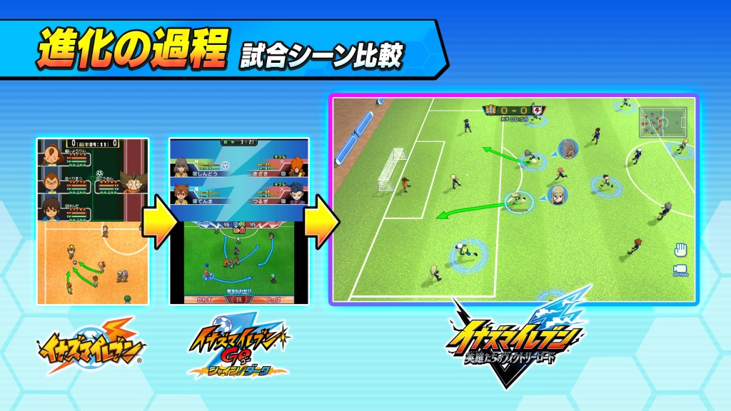 Exit « Great Road », le jeu s’appelle désormais Inazuma Eleven Victory Road (Eiyuu-tachi no Victory Road, La route des héros vers la victoire), et proposera une nouvelle histoire, suivant les aventures d’une nouvelle équipe. De version « deluxe » d’Inazuma Eleven Ares à un reboot/best-of de la série, le projet semble maintenant parti pour être un véritable nouvel épisode à part entière — mais avec suffisamment de contenu issu des épisodes précédents pour satisfaire les fans de la première heure. Découvrons la nouvelle identité de ce projet à travers le dernier article du blog de développement, qui pour l’occasion a été réinitialisé et vidé de son précédent contenu.