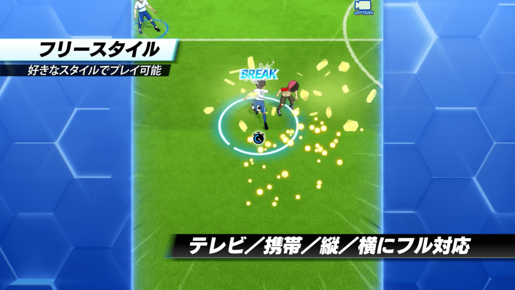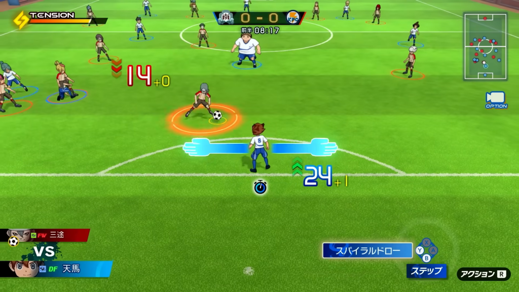 La majeure partie des affrontements passeront maintenant par le mode « Focus ». Lorsqu’un adversaire est à proximité et veut s’emparer du ballon, des flèches en forme de bras indiquent la distance qu’il est capable de couvrir, et donnent une idée de la difficulté de la confrontation. Des chiffres sont également affichés à côté de chaque joueur, vraisemblablement pour quantifier la puissance de chaque côté. En un temps limité, il faudra décider par quel côté progresser en déplaçant son personnage, et choisir une action parmi faire une passe à un allié, tenter de dribbler l’adversaire, ou bien utiliser une supertechnique. Si la confrontation est un succès, des points de Tension sont obtenus. Le système reste globalement le même lorsque les rôles sont inversés, mais seule une option de déplacement (« step ») est possible en dehors des supertechniques, pour tenter de bloquer l’adversaire.