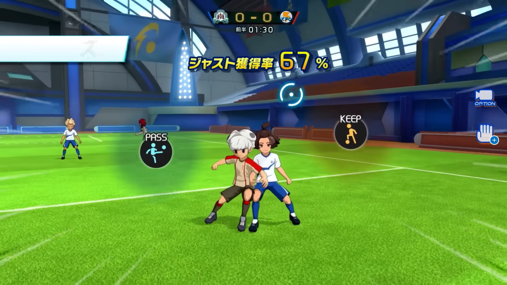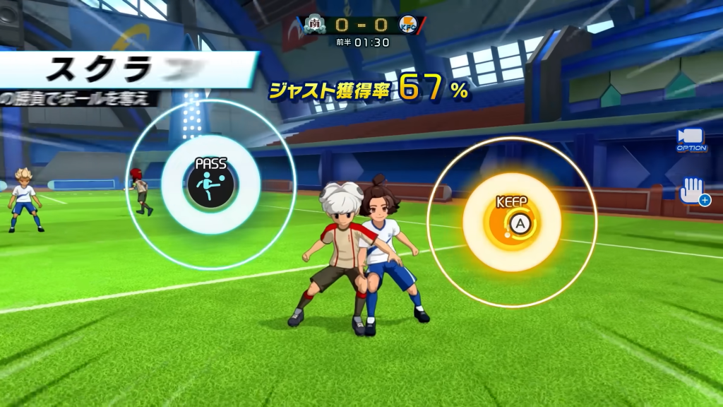 Le mode « Scramble » est quant à lui beaucoup situationnel, ne concernant que les confrontations où deux joueurs tentent de recevoir/intercepter une passe en même temps. Dans les premiers jeux, lorsque cela arrivait, une cinématique montrant l’affrontement était jouée, et le résultat était décidé aléatoirement : soit la balle était interceptée et conservée par un des joueurs, soit elle était redirigée d’un coup de tête. Avec ce nouveau mode, il sera possible de choisir une action plutôt que de laisser le jeu décider pour nous. Il faudra déplacer un curseur vers l’icône de l’action voulue : passer la balle à un allié (« PASS »), ou la conserver (« KEEP »). En plus de devoir être sélectionnées en un temps limité, les icônes sont en mouvement, et doivent être confirmées avec le bon timing (lorsque les deux cercles s’alignent) ; il faudra donc être très réactif et précis pour remporter ces confrontations. Il y aura également une part de chance : dans l’exemple de la vidéo, le joueur contrôlant Kisoji n’a que 67% de voir l’action choisie réussir. Cette probabilité dépend probablement de la puissance des personnages, comme pour les autres types de confrontation.