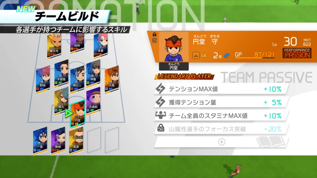 Il y a des aspects qui ne changent pas : il est toujours possible d’avoir jusqu’à 16 joueurs dans son équipe, 11 titulaires et 5 remplaçants. Les types (attaquant, défenseur etc.), éléments (feu, bois, etc.), ou encore les animations de célébration sont toujours de la partie. Si on ne doute pas que les personnages disposent toujours de statistiques individuelles (frappe, défense etc.), cet écran n’affiche que le niveau du joueur et sa jauge de GP (PE ou Points d’Énergie en VF). Une partie n’est cependant pas claire : l’icône de cadenas en haut à droite, accompagnée de la lettre B. L’icône pourrait indiquer que le joueur doit être obligatoirement joué dans ce match à cette position, comme dans certains matches scénarisés des précédents jeux ; quant à la lettre… On n’a pas vraiment d’idée, pour être honnête !