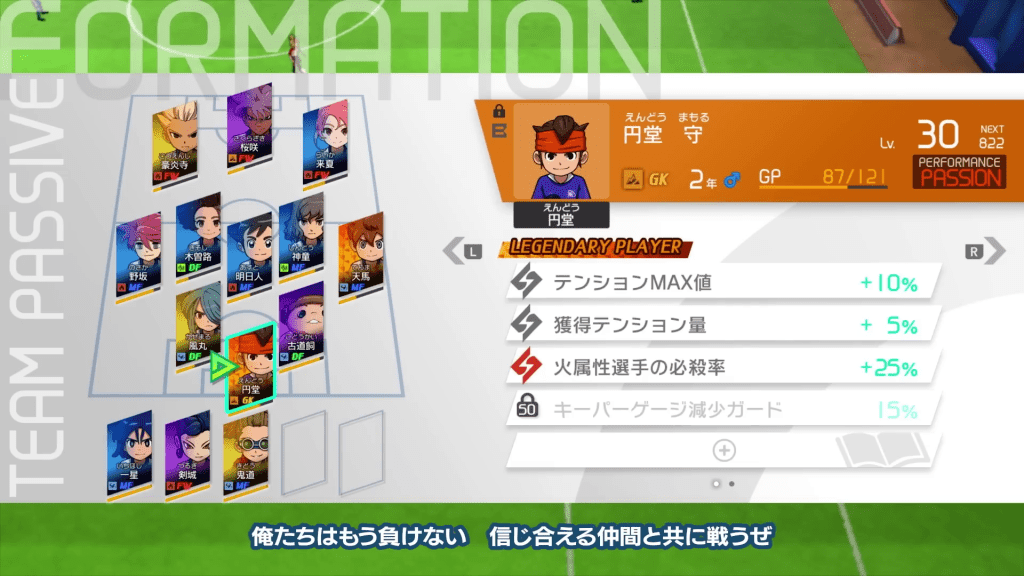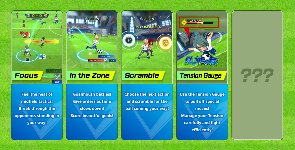 En effet, sur cette image, Endo possède des talents différents de ceux vus la dernière fois ! Cela illustre bien ce qu’expliquait Hino sur son blog : pour un même joueur, avec une même rareté, il sera possible d’obtenir des talents différents. En l’occurrence, son 3ème talent, qui renforçait l’endurance de l’équipe dans la bande-annonce précédente, devient maintenant une augmentation de 25% du « taux de critique » (必殺率 hissatsu-ritsu, il pourrait s’agir d’une simple probabilité d’infliger un coup critique) pour les joueurs d’éléments feu, et son 4ème talent protège contre la réduction d’une « Jauge Gardien » (キーパーゲージ, Keeper Gauge). Cette jauge n’a jamais été mentionnée, mais on imagine qu’il pourrait s’agir d’un système similaire à celui de la Jauge K.O. (Shibire en VO) introduite dans Inazuma Eleven Go 2: Chrono Stone, qui rend le gardien vulnérable aux tirs après avoir encaissé trop d’attaques. Qui plus est, sur le site officiel, à côté des 4 nouvelles mécaniques de gameplay, une 5ème case laisse entendre que d’autres nouvelles mécaniques restent encore à dévoiler — la Jauge Gardien pourrait-elle en faire partie ?
