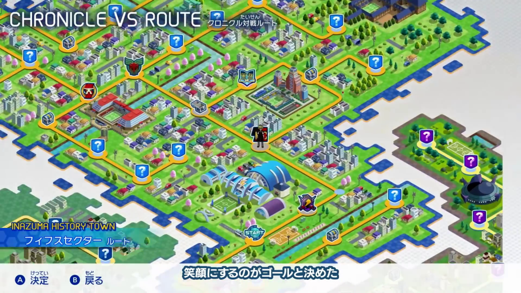 La bande-annonce nous donne ensuite un nouvel aperçu du mode Chronicle, qui rassemble plus de 4500 personnages issus des précédents jeux, et permet de parcourir l’histoire de la série et affronter diverses équipe sur une immense carte. On n’apprend pas grand-chose de plus sur le contenu de ce mode, si ce n’est un rapide aperçu de la région « Inazuma Eleven Go » de la carte, et la confirmation que les boss de fin de chaque épisode seront de la partie, mais il y a toutefois un détail intéressant : on ne contrôle plus Unmei, mais le « Mystérieux Garçon » qui avait été dévoilé le mois dernier sur le blog de développement.