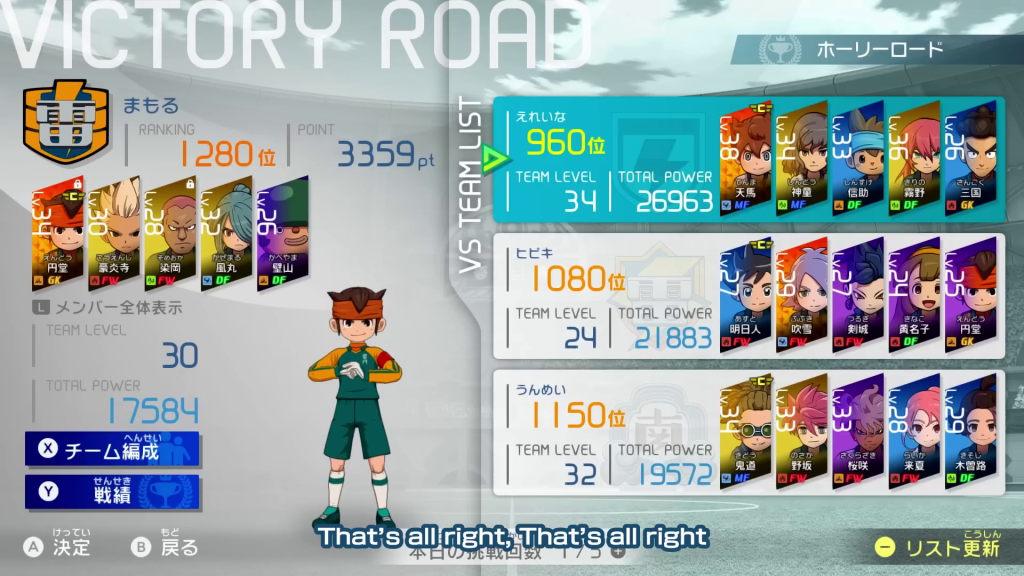 À gauche, on peut voir le profil du joueur, avec son pseudonyme (ici « Mamoru »), son blason, son classement actuel (1280ème) et son score (3359 points). Son équipe est ensuite affichée, avec les 5 premiers joueurs de l’équipe (à la manière de l’équipe de défis du mode Histoire). On peut voir sur chaque vignette de joueur son niveau, la couleur correspondant à sa rareté, une icône « C » vraisemblablement pour indiquer le capitaine, ainsi qu’un cadenas. Ce cadenas, qui évoque l’idée d’un joueur « verrouillé » ou imposé, pourrait servir à indiquer lesquels de ces joueurs sont des joueurs saisonniers, c’est à dire des joueurs imposés par le jeu dans le cadre d’une saison de championnat en particulier. Le niveau de l’équipe et sa puissance totale sont ensuite affichés, avec la possibilité d’afficher la formation complète en appuyant sur L. Le bouton X permet de changer la composition de son équipe, et Y d’afficher ses records.