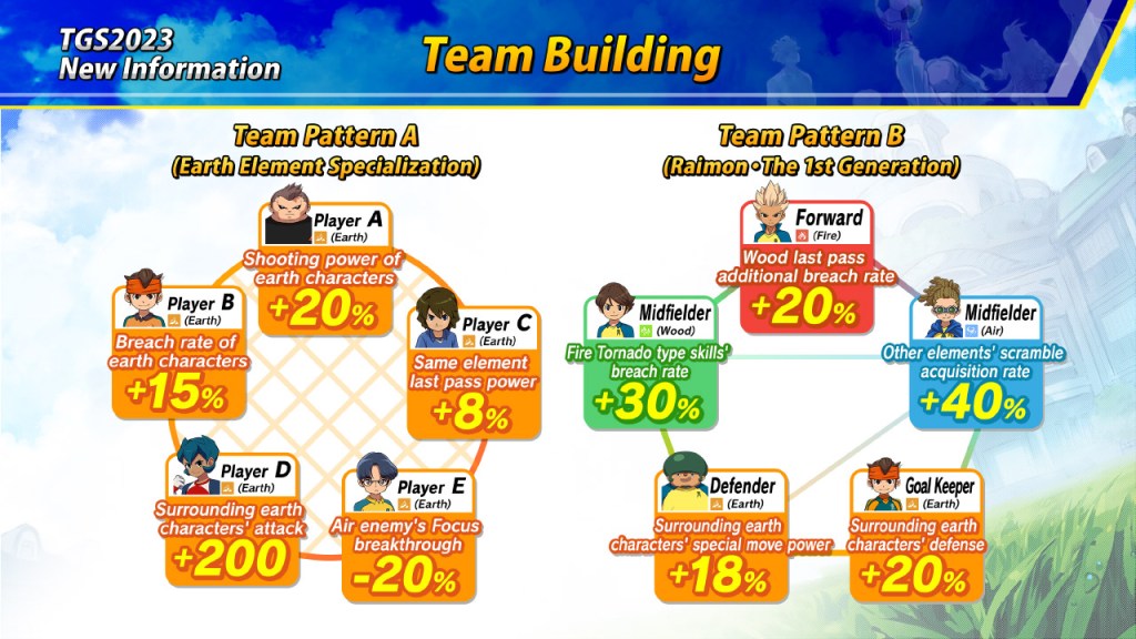 [Exemple d’équipe A (Spécialisation dans l’élément Terre) – Joueur A (Terre) : Puissance des tirs des personnages Terre +20% – Joueur B (Terre) : Taux de percée des personnages Terre +15% – Joueur C (Terre) : Puissance de la dernière passe si même élément +8% – Joueur D (Terre) : Attaque des personnages Terre à proximité +200 – Joueur E (Terre) : Réussite des dribbles Focus des adversaires Air -20% Exemple d’équipe B (Raimon, 1ère Génération) – Attaquant (Feu) : Taux de percée de la dernière passe d’un joueur Bois +20% – Milieu de terrain (Bois) : Taux de percée des techniques de type Fire Tornado +30% – Milieu de terrain (Air) : Taux d’interception en Scramble si élément différent +40% – Défenseur (Terre) : Puissance des supertechniques des personnages Terre à proximité +18% – Gardien (Terre) : Défense des personnages Terre à proximité +20%]