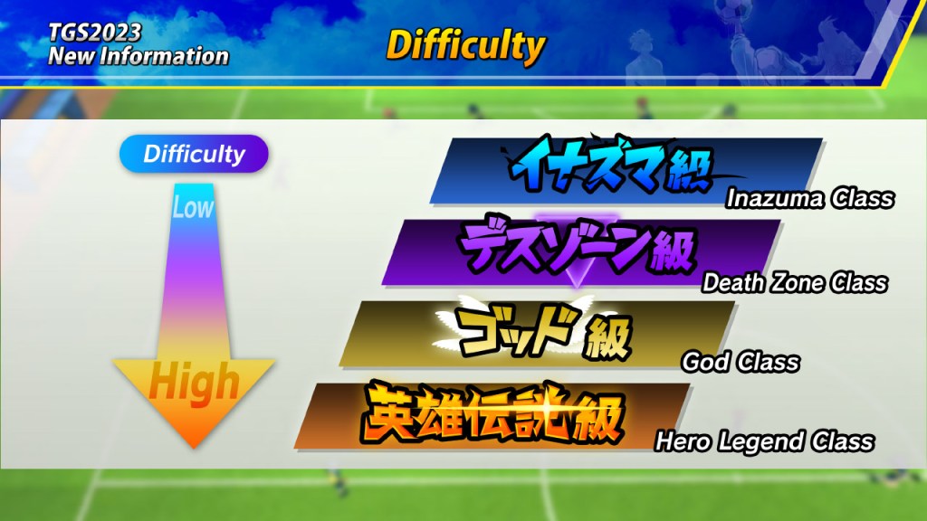 [De haut en bas : Classe Inazuma, Classe Triangle de la Mort, Classe Céleste, Classe Héros Légendaire. Plus la classe est basse dans la liste, plus elle est difficile.]