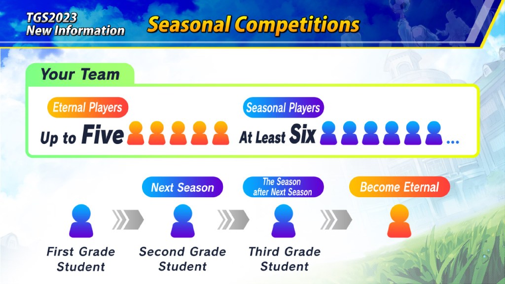 Lors des tournois en ligne, vous devrez participer avec une combinaison d’au moins 6 joueurs saisonniers et au plus 5 joueurs éternels. Les joueurs saisonniers sont ceux qui peuvent être obtenus exclusivement au cours d’une saison, tandis que les joueurs éternels sont principalement ceux que vous aurez recrutés dans les modes de jeu solo. L’utilisation des joueurs saisonniers ne ne se limite pas qu’à une saison, mais à chaque nouvelle saison qui passe, ils avancent d’une classe. Après avoir atteint la 3ème année scolaire, ils sont diplômés et deviennent des joueurs éternels. Si vous voulez continuer à les utiliser, ils devront occuper une place de joueur éternel.