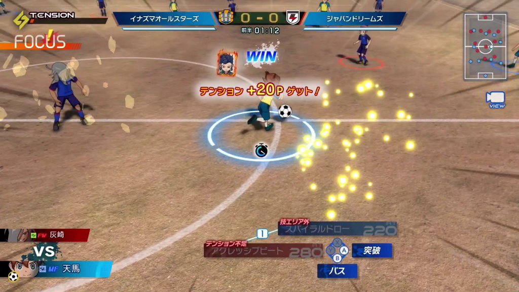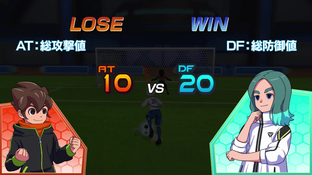 Unmei explique à Haru le principe des puissances AT et DF. Ces valeurs sont comparées lors d’une confrontation entre deux personnages : duels Focus, tirs, mais aussi affrontements entre deux supertechniques. Tout simplement, la valeur la plus grande l’emporte, donc pour marquer avec une technique de tir face à une technique de gardien, il faudra avoir une plus grande AT que la DF du gardien, et vice-versa. Un système somme toute très similaire à ce qui existait déjà dans les jeux précédents.