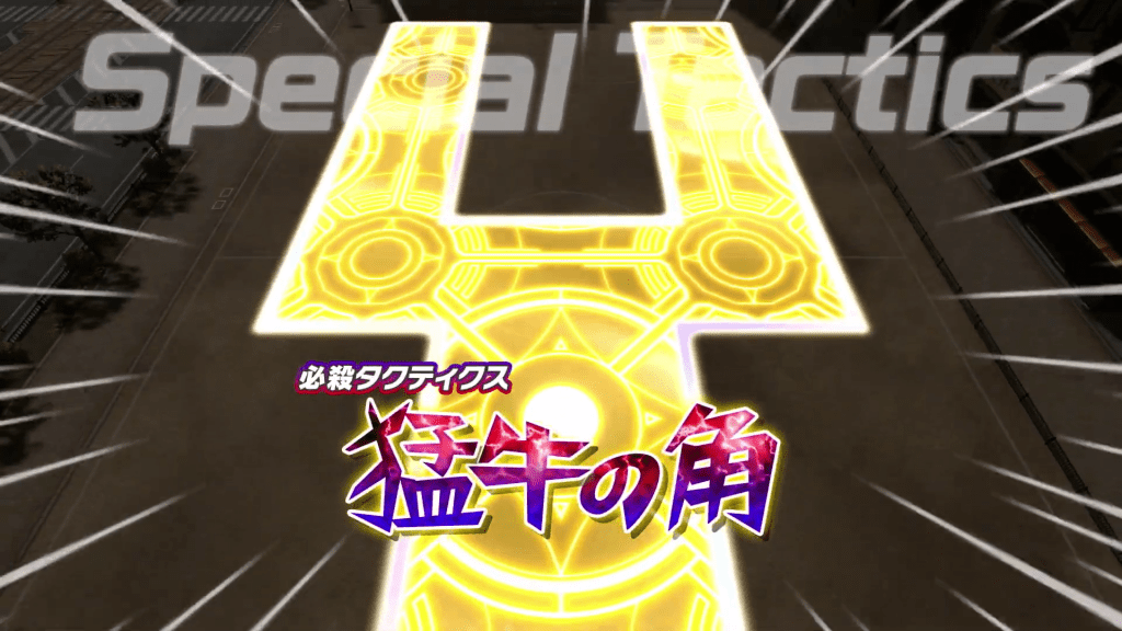 Supertactiques (Hissatsu Tactics) : leur présence dans le jeu avait déjà été évoquée, nous les voyons maintenant en action, avec comme exemple une nouvelle tactique appelée Mougyuu no Kaku (Corne du Taureau Enragé). Dans ce jeu, les tactiques prennent la forme de glyphes recouvrant certaines parties du terrain ; vraisemblement, l’effet de la tactique n’est actif que sur ces parties.