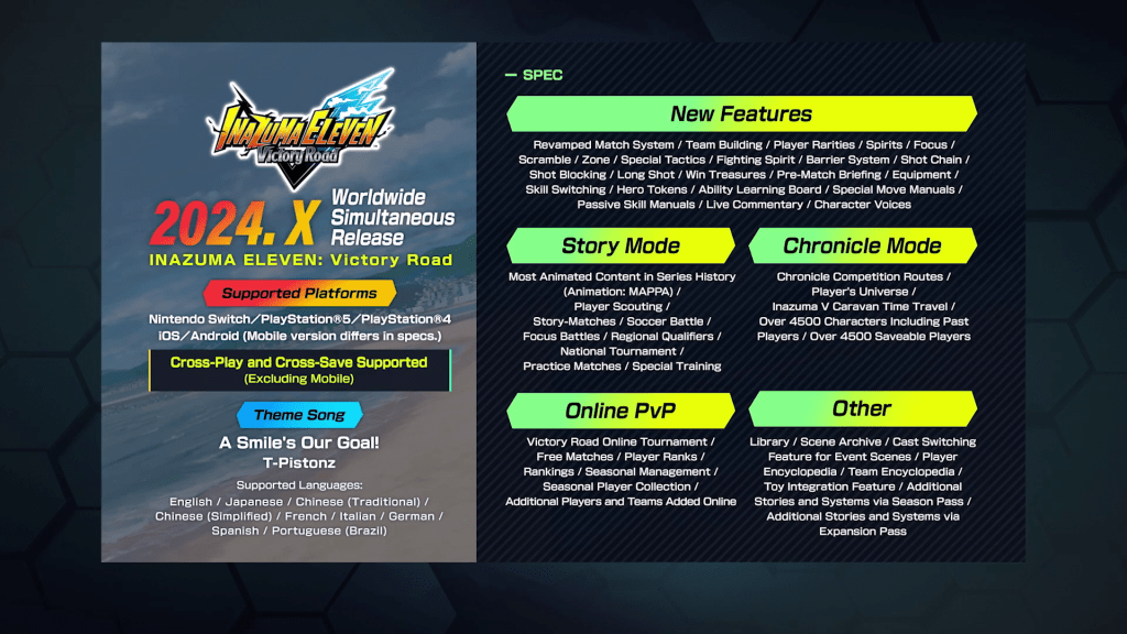 Inazuma Eleven: Victory Road est actuellement en développement sur Nintendo Switch, PlayStation 5, PlayStation 4, iOS et Android, et vise une sortie mondiale simultanée en 2024.