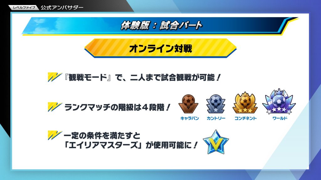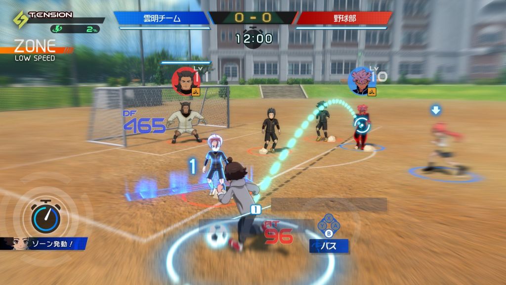 - Une nouvelle mécanique appelée « Kizuna Power » (puissance d’amitié), représentée par une icône en forme d’éclair dans le coin supérieur gauche de l’écran, a pu être aperçue pendant la démonstration. Cette puissance, exprimée en pourcentage, s’accumule à mesure que les joueurs font des passes entre eux, et vient s’ajouter à la puissance des tirs. (Mise à jour 21/2 : l’icône peut être aperçue sur cette image d’un défi de football partagée par Hino sur Twitter)