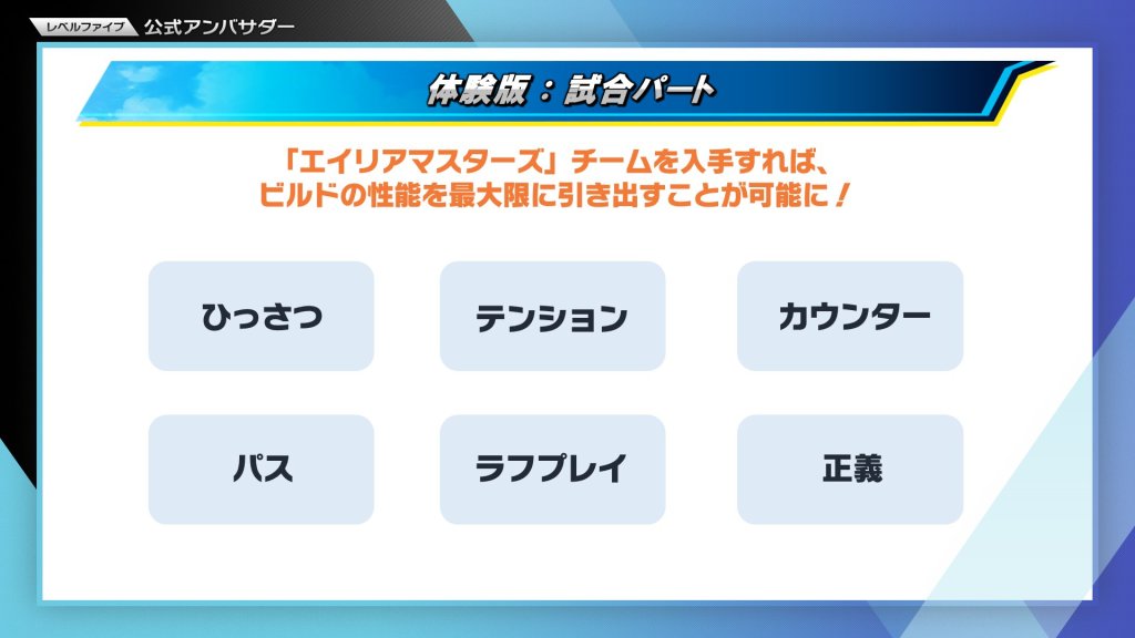 Alia Masters se veut être une équipe qui « permettra de maximiser la performance de son build ». La présentation faite aux ambassadeurs en a profité pour évoquer 6 types de build auxquels peuvent correspondre les personnages : « Supertechniques » (VO: hissatsu, « fatal » ou « mort certaine », mais nous pensons que cela fait plus précisément référence aux techniques, hissatsu waza, dans ce contexte), « Tension », « Contre-attaque » (VO: counter), « Passes », « Jeu violent » (VO: rough play), et « Justice » (VO: seigi).