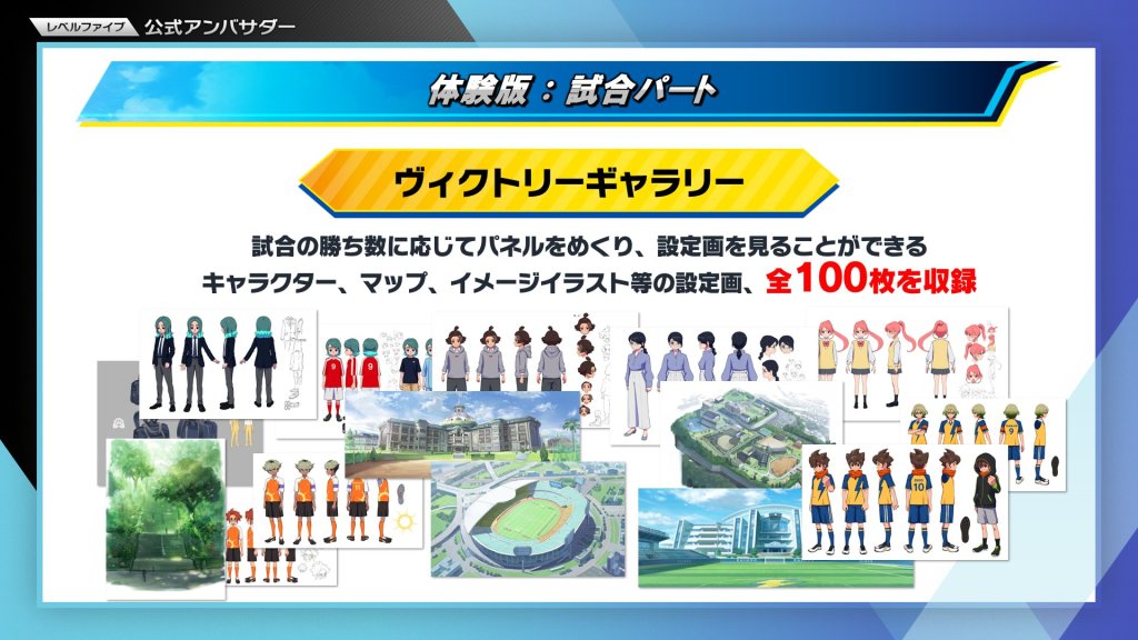 La présentation faite aux ambassadeurs nous donne un aperçu de quelques illustrations que l’on pourra trouver dans cette galerie. On y trouve notamment des concept art d’Unmei enfant, de la professeur et/ou future coach du collège Nagumohara apparue dans la dernière bande-annonce, ou encore de nouveaux joueurs d’une école inconnue (l’un d’eux apparaissait sous forme de silhouette dans la toute première bande-annonce). On peut également voir ce qui semble être le nouveau collège Raimon, qui est de toute beauté 25 ans après les événements du premier jeu !