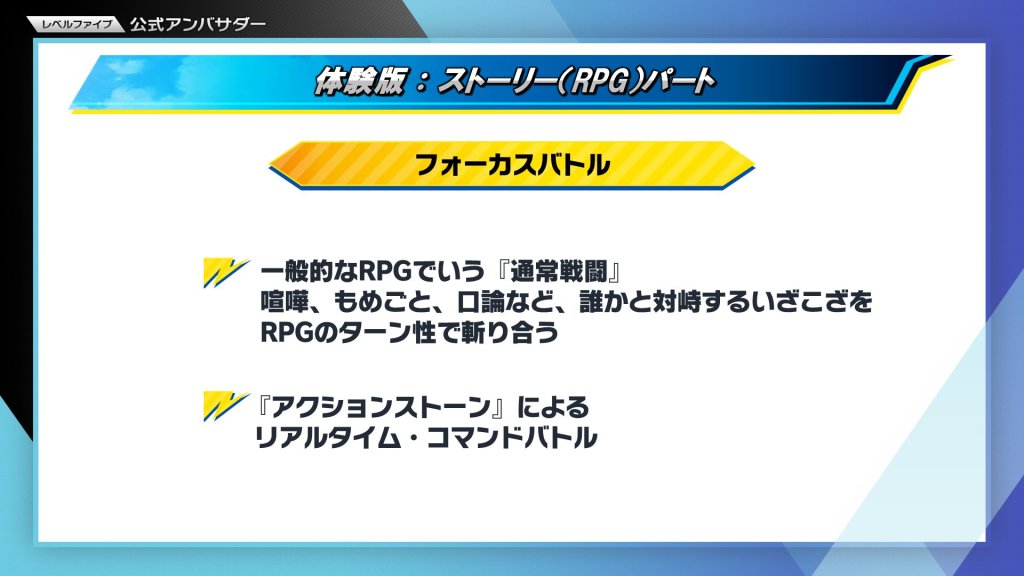 Akihiro Hino a partagé sur Twitter deux captures d’écran de la bêta, dont une montrant un Focus Battle. On peut notamment y voir les « Action Stones » indiquant le nombre d’actions restantes, et des actions possédant des icônes « pierre-feuille-ciseaux », laissant entendre des affinités de ce genre entre actions. Il y aura également les éléments des personnages à prendre en compte.