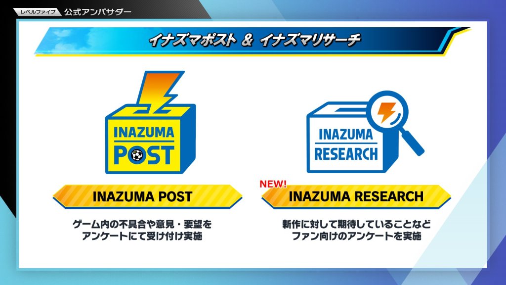 Level-5 lancera un programme appelé Inazuma Research, en complément du programme Inazuma Post. Si Inazuma Post permettait aux joueurs de partager les bugs rencontrés, leurs avis et leurs demandes via un questionnaire afin d’aider au développement, Inazuma Research visera plutôt à recueillir les attentes des fans pour ce nouveau jeu, également via un questionnaire.