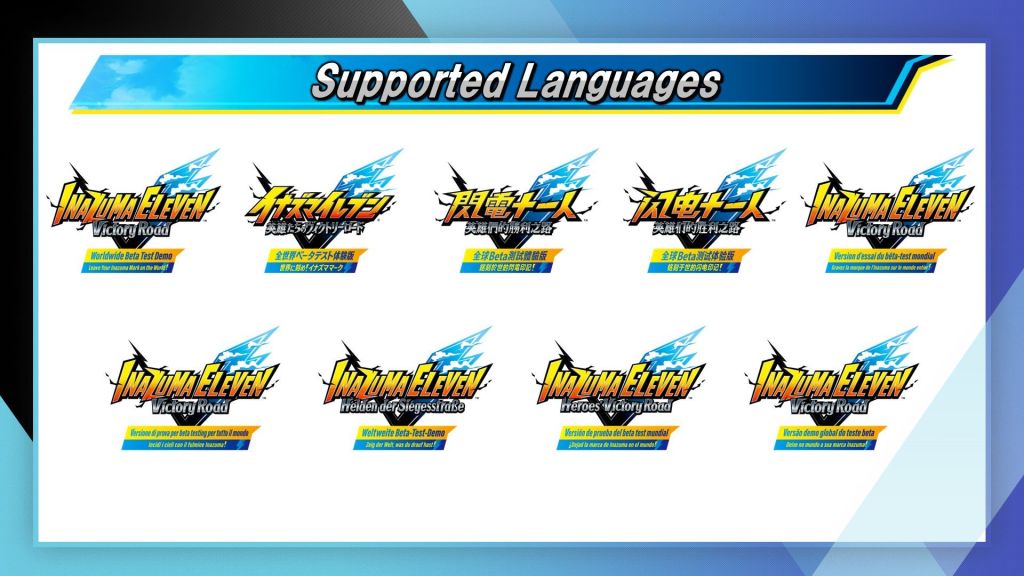 En France, pas de changement : le jeu s’appellera bien Inazuma Eleven: Victory Road comme en anglais. Plus précisément, le titre complet de la démo est « Inazuma Eleven: Victory Road – Version d’essai du bêta-test mondial : Gravez la marque de l’Inazuma sur le monde entier ! ».